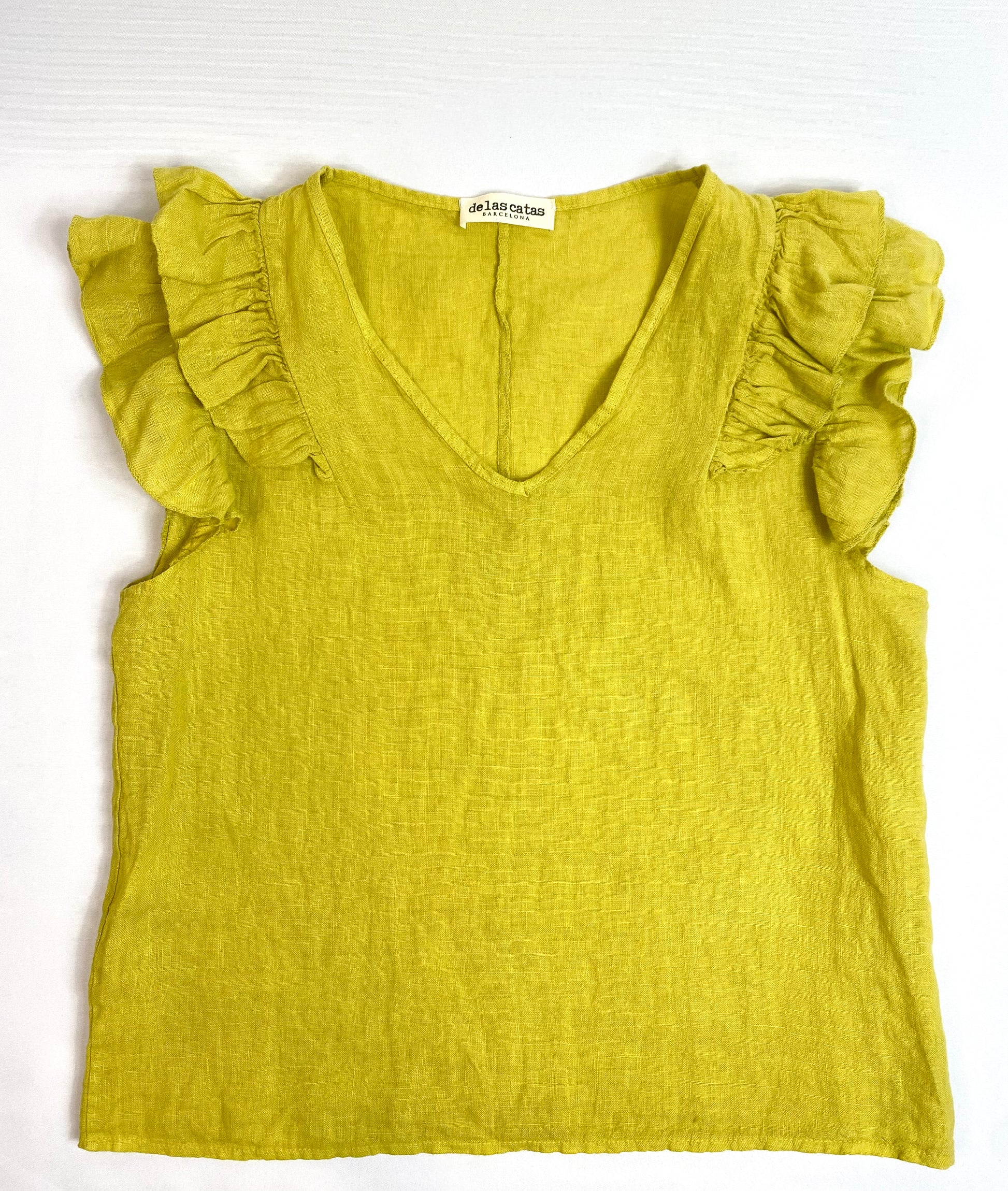 Esta blusa 100 % lino destaca por su tejido natural y transpirable, ideal para mantener la frescura en climas cálidos. Los volados aportan un toque elegante y femenino, combinando comodidad y estilo en una prenda versátil para diversas ocasiones.